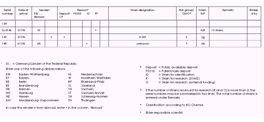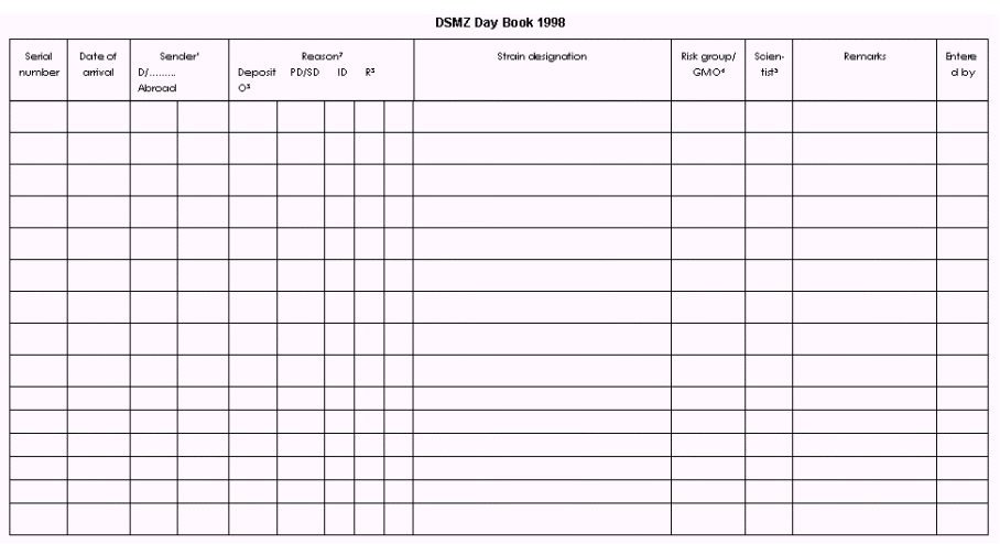 DSMZ Day Book, Explanations All cultures sent to the DSMZ have to be registered by entering a serial number, date of arrival, strain designation etc. into the DSMZ Day Book. Cultures are then forwarded to the addressee or to the responsible person which may be identified through consultation of the list of DSMZ Responsibilities (DSMZ General Information 103/02/1997). If no Accession Form or covering letter is attached, the culture is stored for an intermediate period in a refrigerator of the laboratory or in another appropriate place to secure survival for some time. In case of problems the Head of the Department has to be contacted .